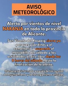 San Vicente del Raspeig cierra ya parques y jardines y el cementerio municipal, salvo para entierros, y suspende el mercadillo del sábado y las actividades al aire libre desde las 8 horas del sábado hasta la finalización de la alerta, siguiendo las recomendaciones de Emergencias