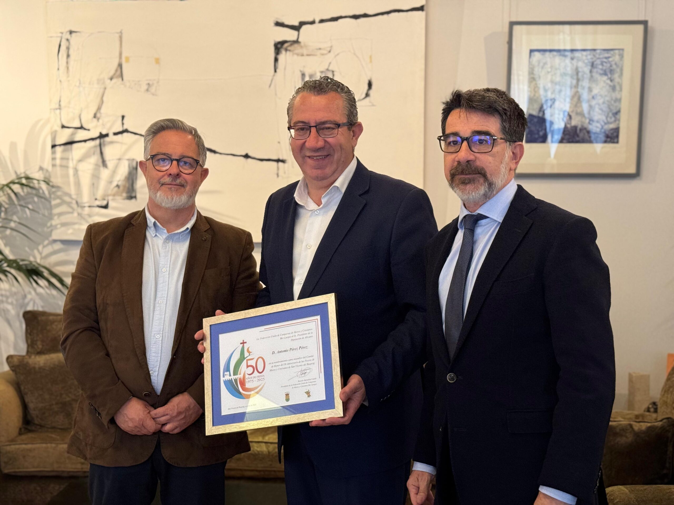El presidente de la Diputación de Alicante, Toni Pérez, ha recibido el título que le acredita como miembro del Comité de Honor constituido con motivo de la conmemoración del 50 aniversario de las Fiestas de Moros y Cristianos de San Vicente del Raspeig.