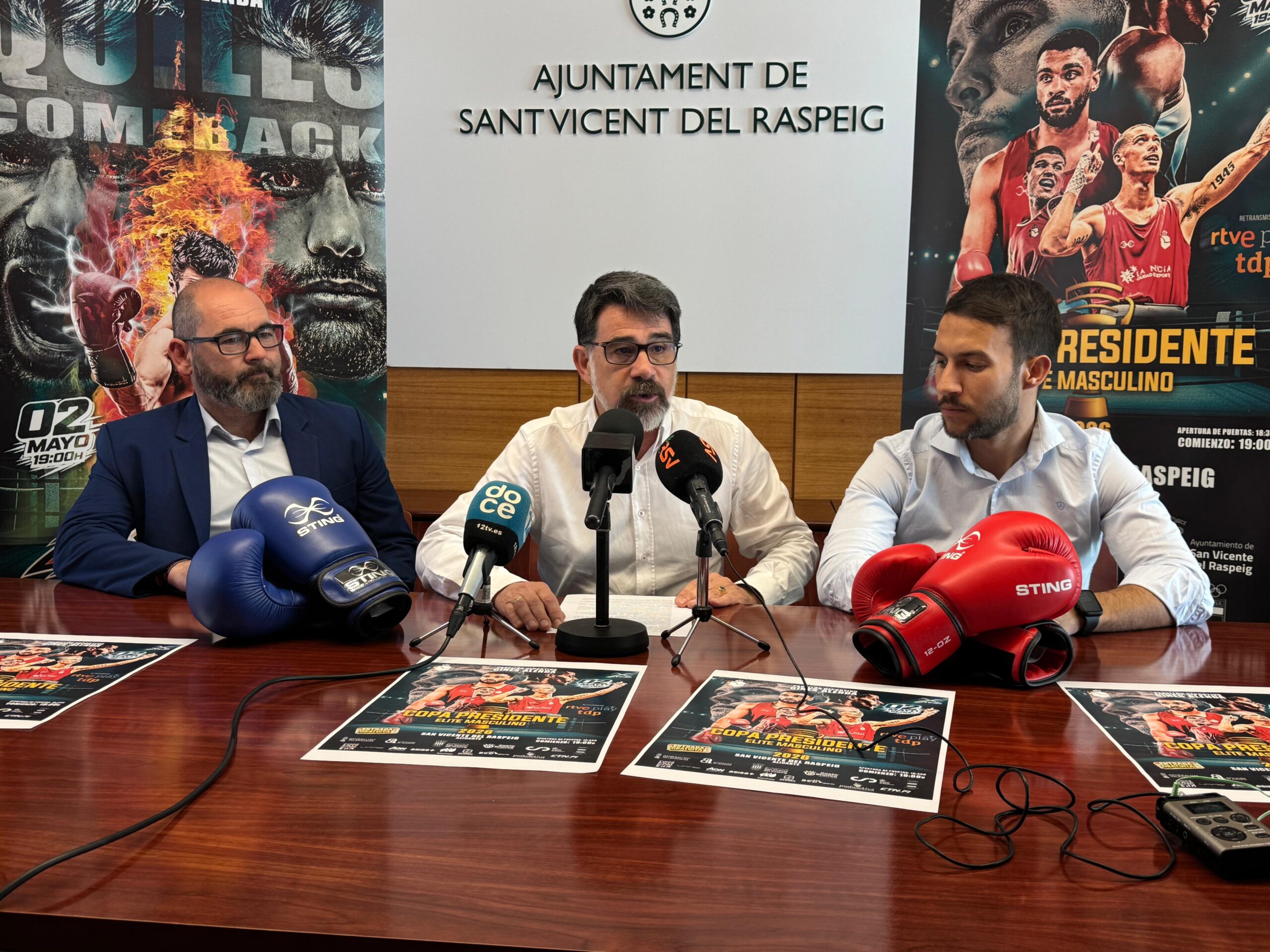 San Vicente del Raspeig acogerá el 2 de mayo una nueva edición de la Copa Presidente Élite Masculina en las instalaciones del Pabellón Deportivo Ginés Alenda. La convocatoria deportiva de alcance nacional ha sido presentada esta mañana por el alcalde, Pachi Pascual, el concejal de Deportes, Ricardo Bernabeu, y el presidente de la Real Federación Española de Boxeo, Felipe Martínez, que han confirmado la presencia del equipo olímpico español de boxeo.