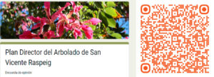 Para ello, además de los documentos técnicos que forman parte del Plan, se incorpora una encuesta para que la ciudadanía pueda opinar acerca de la percepción que tienen sobre el arbolado municipal de San Vicente del Raspeig: